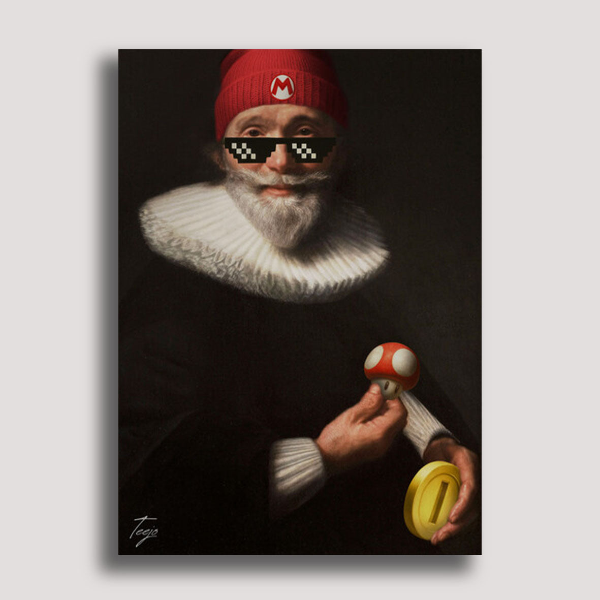 Teejo fusionne ici le raffinement de la peinture d’époque avec les codes pop contemporains : bonnet rouge, lunettes pixelisées “deal with it”, champignon power-up et pièce d’or – autant de symboles instantly reconnaissables par toute une génération.